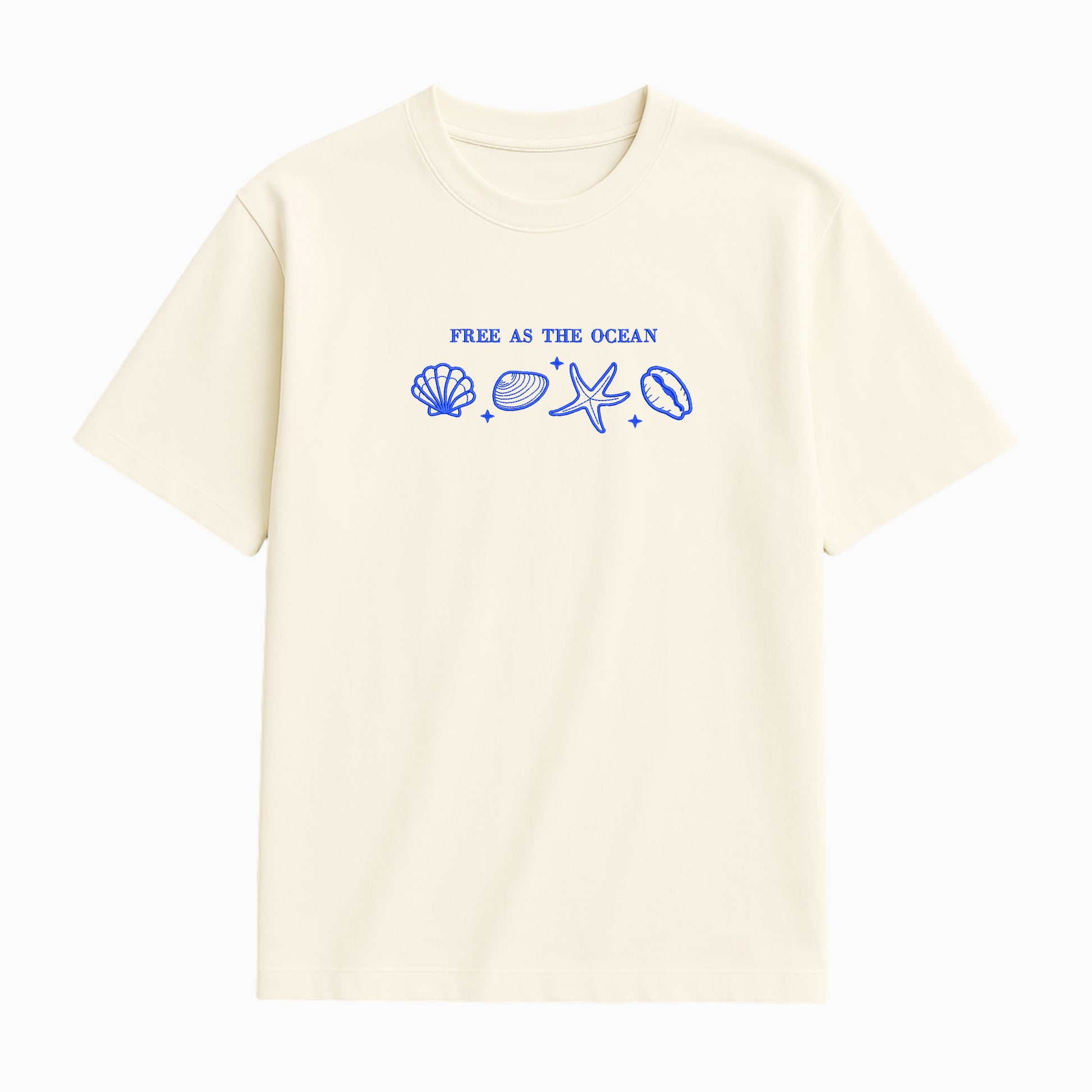 Embrace the spirit of the open sea with our "Free As The Ocean" embroidered t-shirt. This soft cream tee features a delicate blue embroidered design of seashells and a starfish, perfect for adding a touch of coastal freedom to your wardrobe.