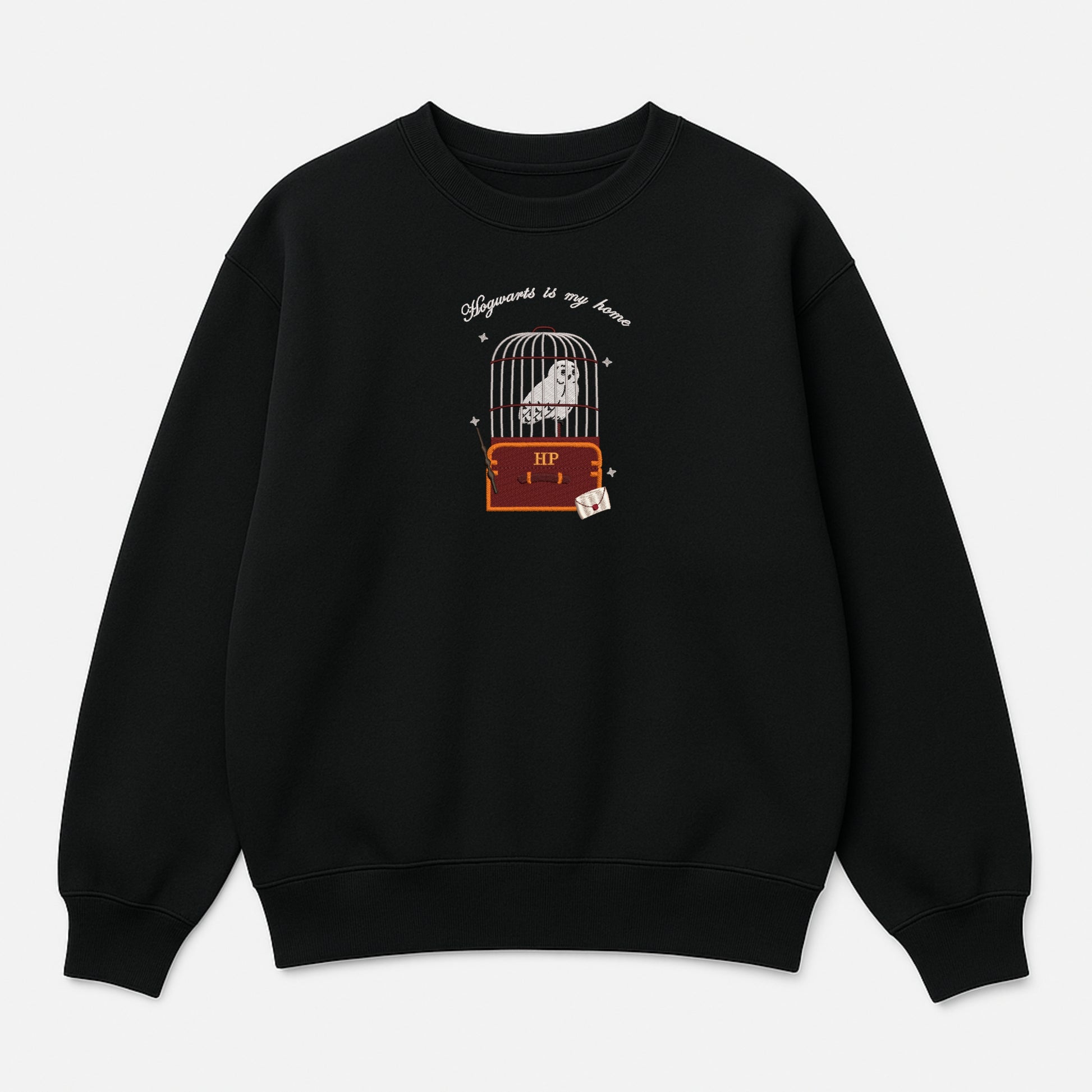 Cozy up in wizarding style with our exclusive "Hogwarts Is My Home" embroidered sweatshirt! This premium black crewneck features intricate embroidery that brings the magic of Harry Potter to life. At its heart, a charming Hedwig-like owl sits comfortably within its cage, symbolizing the comfort and familiarity of the wizarding world. Below, a classic Hogwarts trunk proudly displays the "HP" emblem, flanked by a magical wand and a sealed letter – perhaps your very own acceptance to Hogwarts!